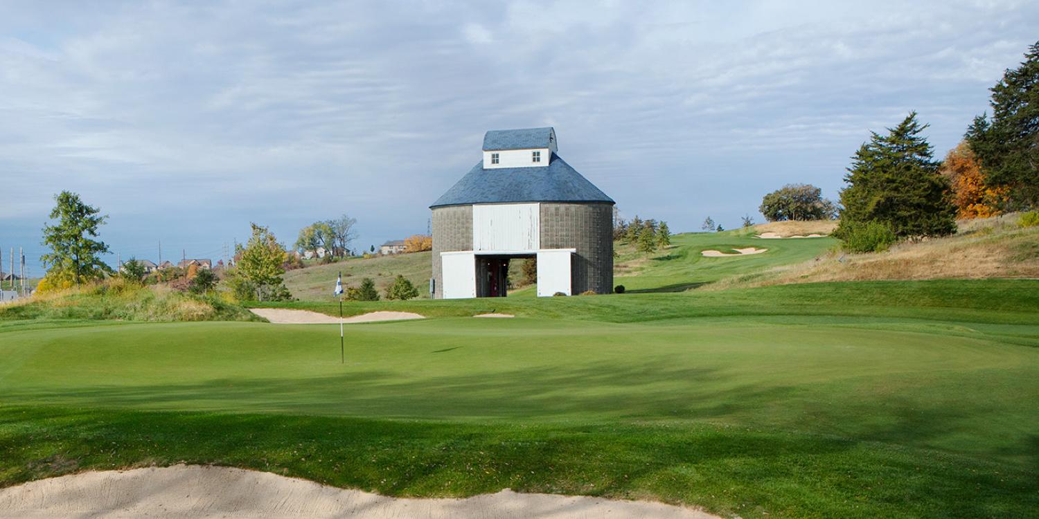 Hole #16. This par 5 is the longest hole in Iowa at 665 yards. From the tee, the green looks like it is 5 miles away. This hole requires 3 good shots to get to the green. The tee shot is protected by natural areas on the left, a bunker on the right, and a creek that cuts off the fairway. Distance, control, and accuracy are important.